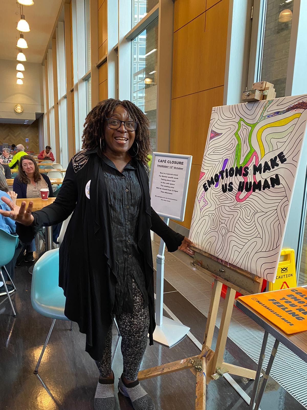 In addition to our usual message writing we also encouraged people to colour in the emotion they were feeling in order to create a colourful collaborative art piece. Each colour was assigned an emotion and members of the public were encouraged to colour in the canvas as they please. City Lit's Mental Wealth Festival was an incredible opportunity for us to connect with other creatives that use art and creativity to aid their mental health and well-being.